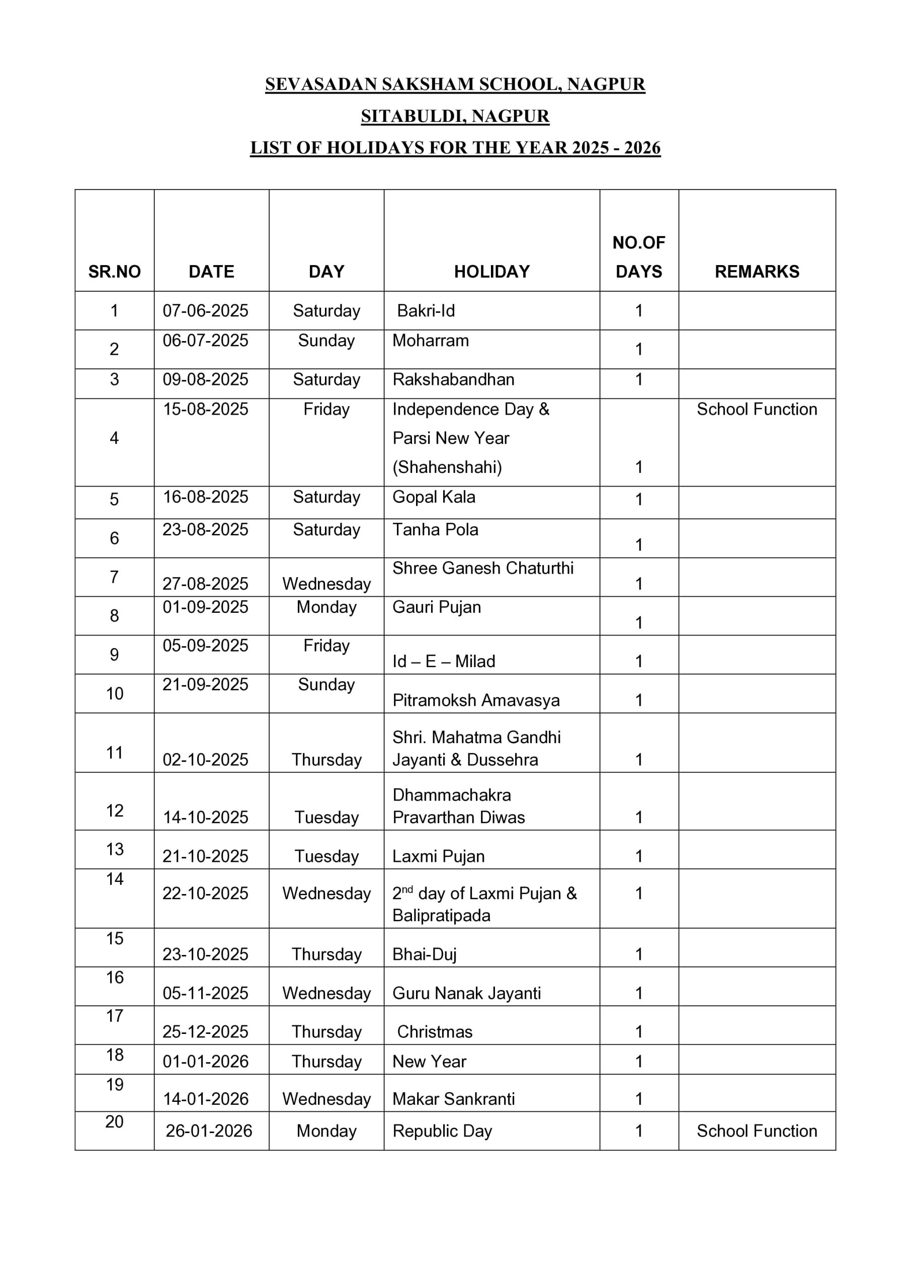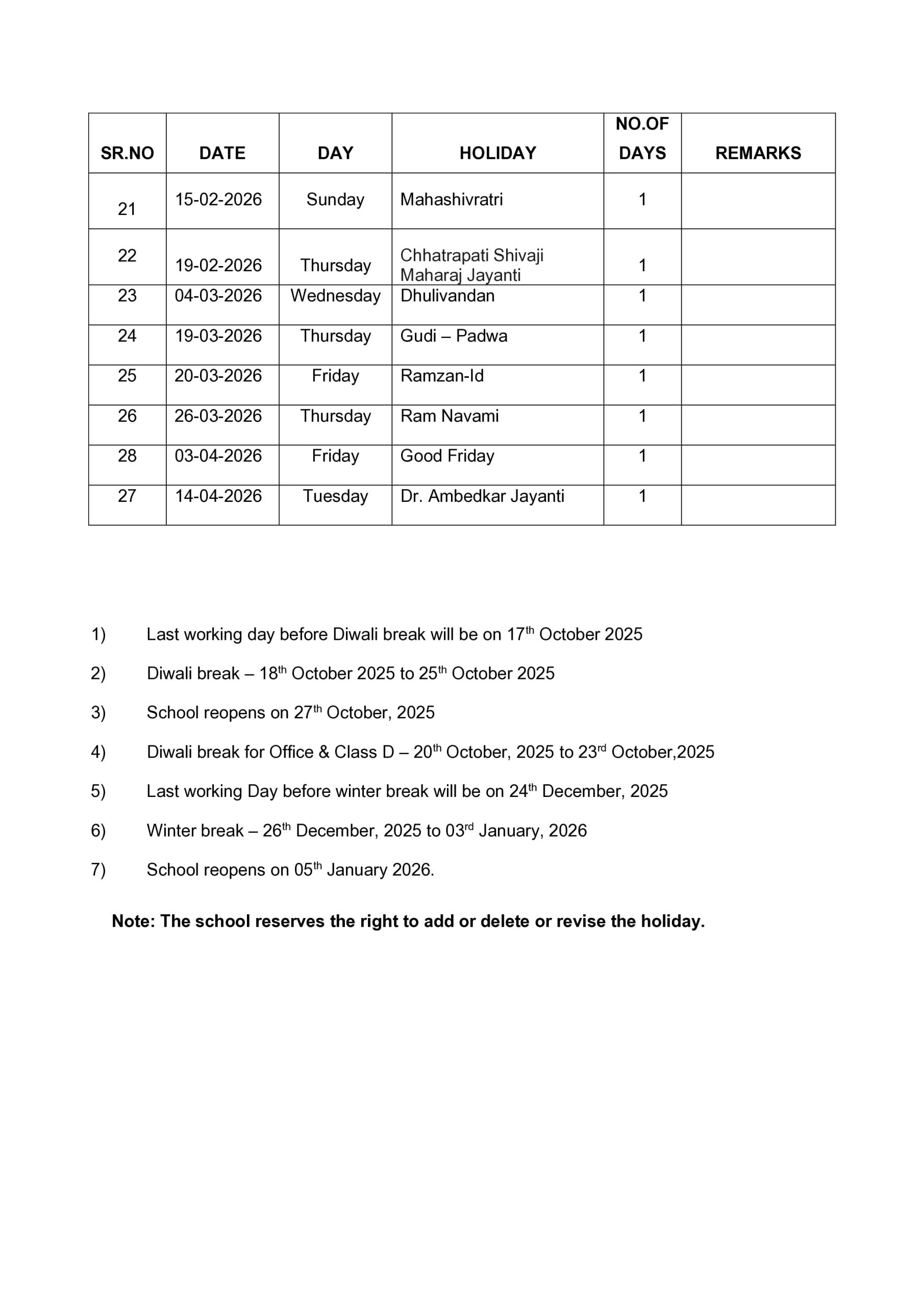 LIST OF HOLIDAYS FOR THE YEAR 2025 - 2026